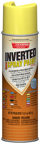 Champion Sprayon® Inverted Paint can be used for handheld applications (accurate marking 5” to 12” above the ground), or with a Champion Sprayon Long or Short Wand. Spray on asphalt, concrete or other paved surfaces, or on dirt, grass or gravel. Lasts 4-6 months, depending upon traffic and exposure.