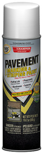 Champion Sprayon® Pavement Striping Paint is designed for striping asphalt, concrete or other paved surfaces. The discharge valve sprays only in a downward position. The universal tip fits all machines. Use it with a Champion Sprayon Paint Striper. Stripes 600-800 linear feet. Now toluene free; won't harm grass.