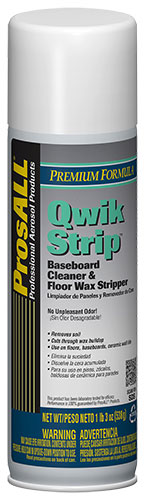 ProsALL® QwikStrip™ helps remove the accumulated buildup of soil and darkened wax that occurs on baseboards and on floors along walls and in low-traffic areas. These deposits are emulsified and easily loosened with a clean pad or brush. The inverted tip sprays a long, wide stream that matches most baseboard widths. The new formula, a combination of penetrating cleaners and detergents in an alkaline base, works better with less odor.