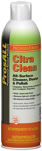 ProsALL® Citra Clean is an all-surface cleaner, duster and polisher. Contains d-Limonene that gives a natural citrus fragrance. Removes light soil, dust, smudges and fingerprints without leaving a waxy buildup. Once treated, surfaces become easier to clean with normal maintenance dusting.- All-surface cleaner, duster and polisher